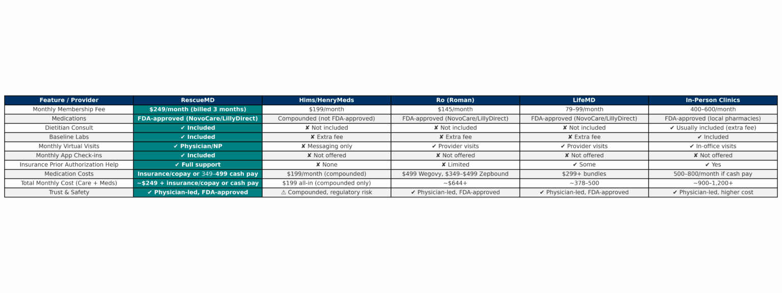 Looking for an “online weight loss clinic” or the best “weight loss clinic near me”? RescueMD offers comprehensive weight management memberships across 14 states. Our program goes beyond prescriptions — combining medical expertise, lifestyle support, and safe access to FDA-approved therapies through trusted pharmaceutical partners like LillyDirect by Eli Lilly and NovoCare by Novo Nordisk